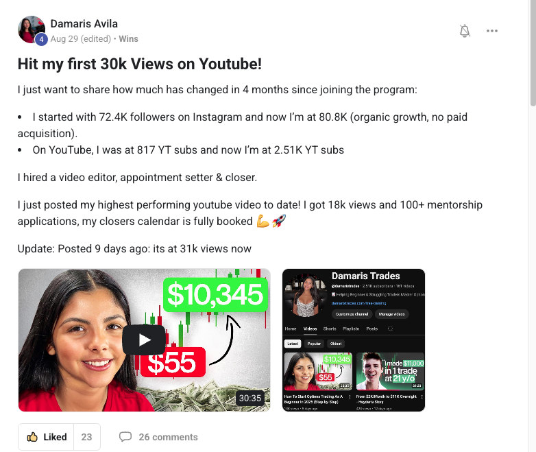 Damaris Avila has seen tremendous growth in just four months — increasing her YouTube subscribers from 817 to over 2.5K and reaching 30K views on her latest video. Her mentorship program is booming with over 100 applications, showing how quickly her content and brand are scaling.