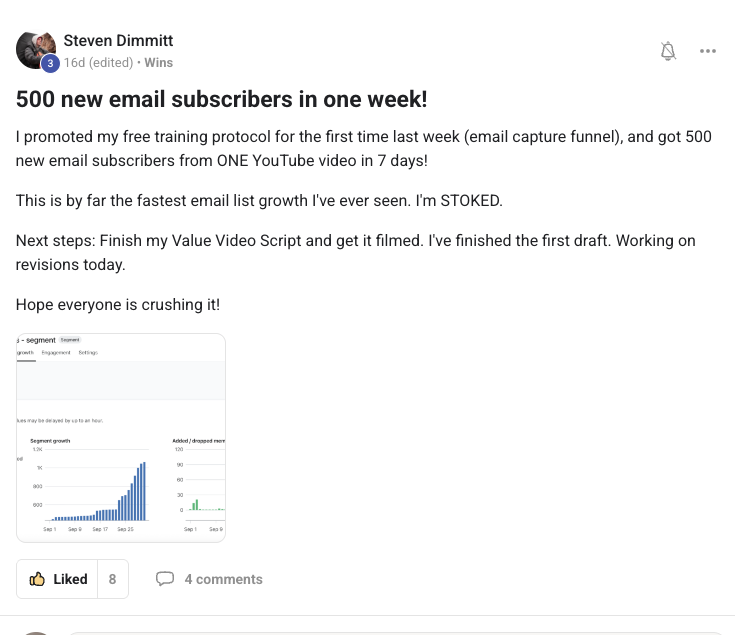 Steven Dimmitt achieved explosive growth, gaining 500 new email subscribers in just one week from a single YouTube video. By promoting his free training protocol, he saw his fastest-ever list growth and is now moving forward with creating his next Value Video Script to keep the momentum going.