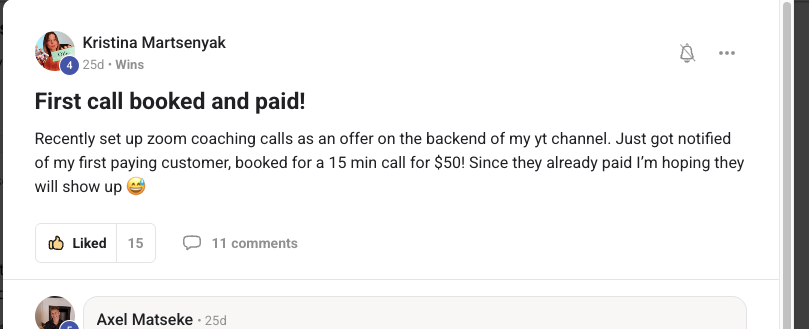 Kristina Martsenyak just landed her first paid coaching client through her YouTube channel! She recently launched Zoom coaching sessions and secured a $50 booking for a 15-minute call — an exciting first step in turning her audience into paying customers.