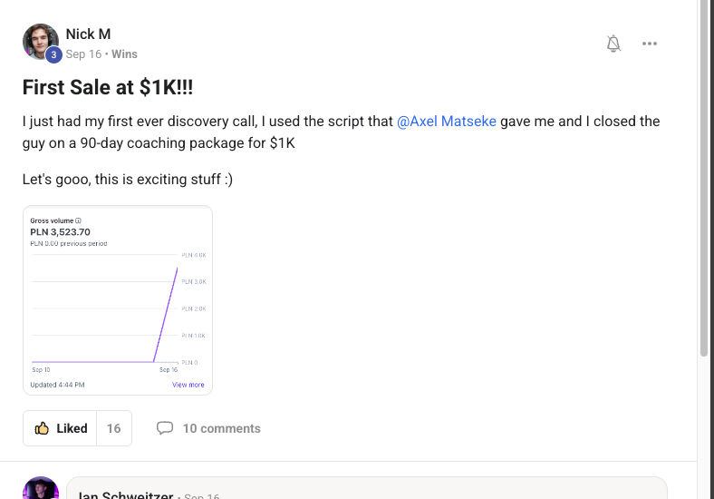 Nick M proudly shared that he landed his very first $1,000 coaching client after using a discovery call script from Axel Matseke. This marks a huge milestone in his business journey — his first successful sale and a big confidence boost for future growth.